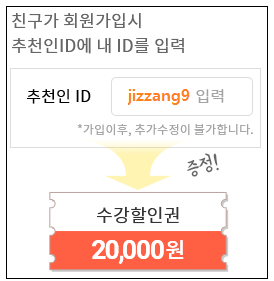 회원가입시 추천인 아이디를 쓰면 결제한 강좌에서 2만원 수강할인권을 받을 수 있다고 하니