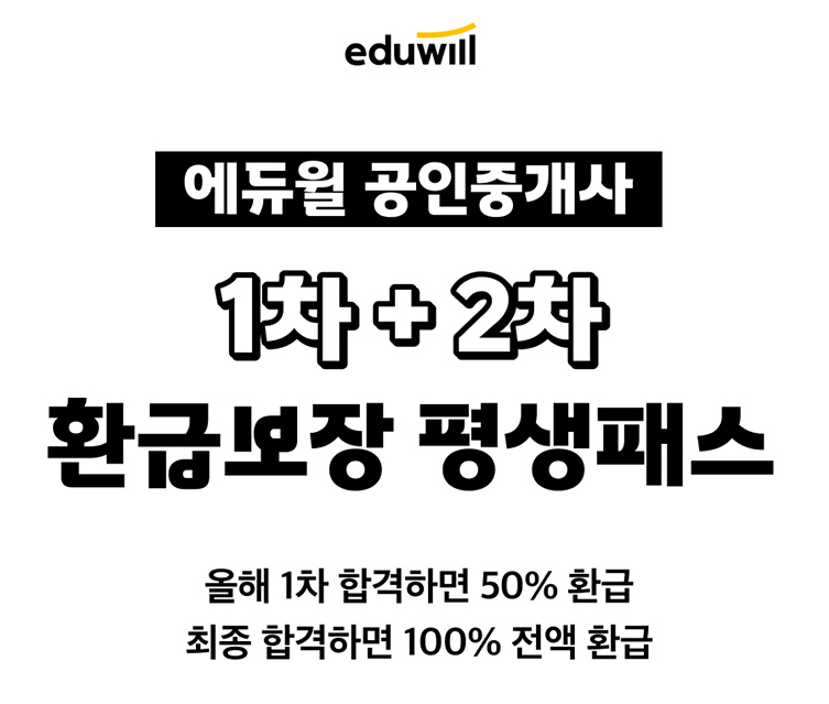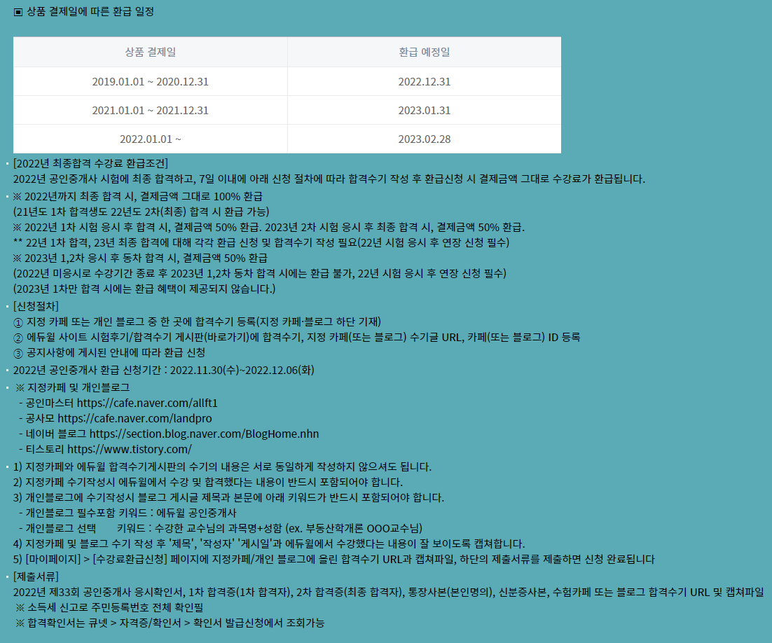 | [100% 전액환급] 조건 : 2022년까지 1+2차 응시 후 최종 합격 시 상품가 그대로 100% 환급 [50% 환급 + 50% 환급] 조건 : 2022년 1차 응시 후 합격 시, 상품가 50% 환급 2023년 2차 응시 후 최종합격 시, 상품가 50% 환급 [50% 환급] 조건 : 2023년 1+2차 응시 후 최종 합격 시, 상품가 50% 환급 |